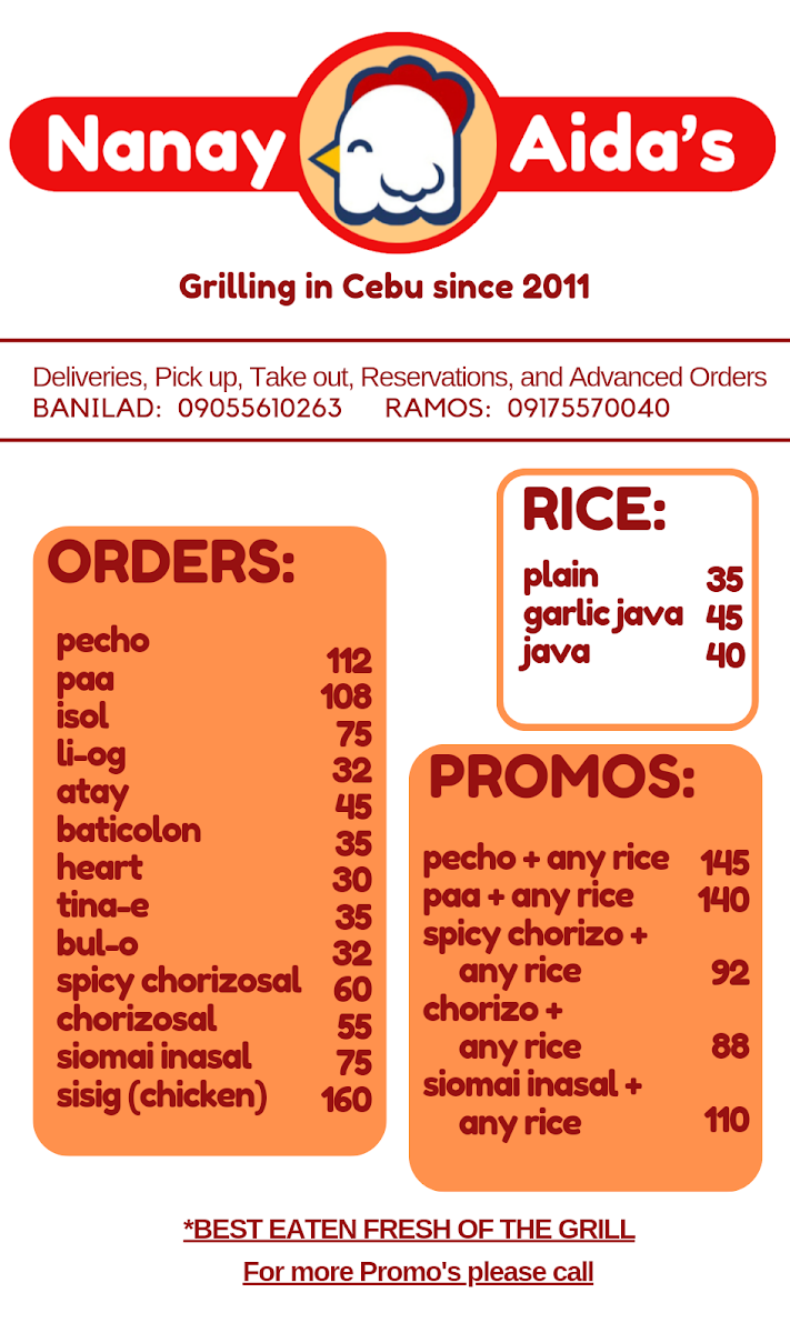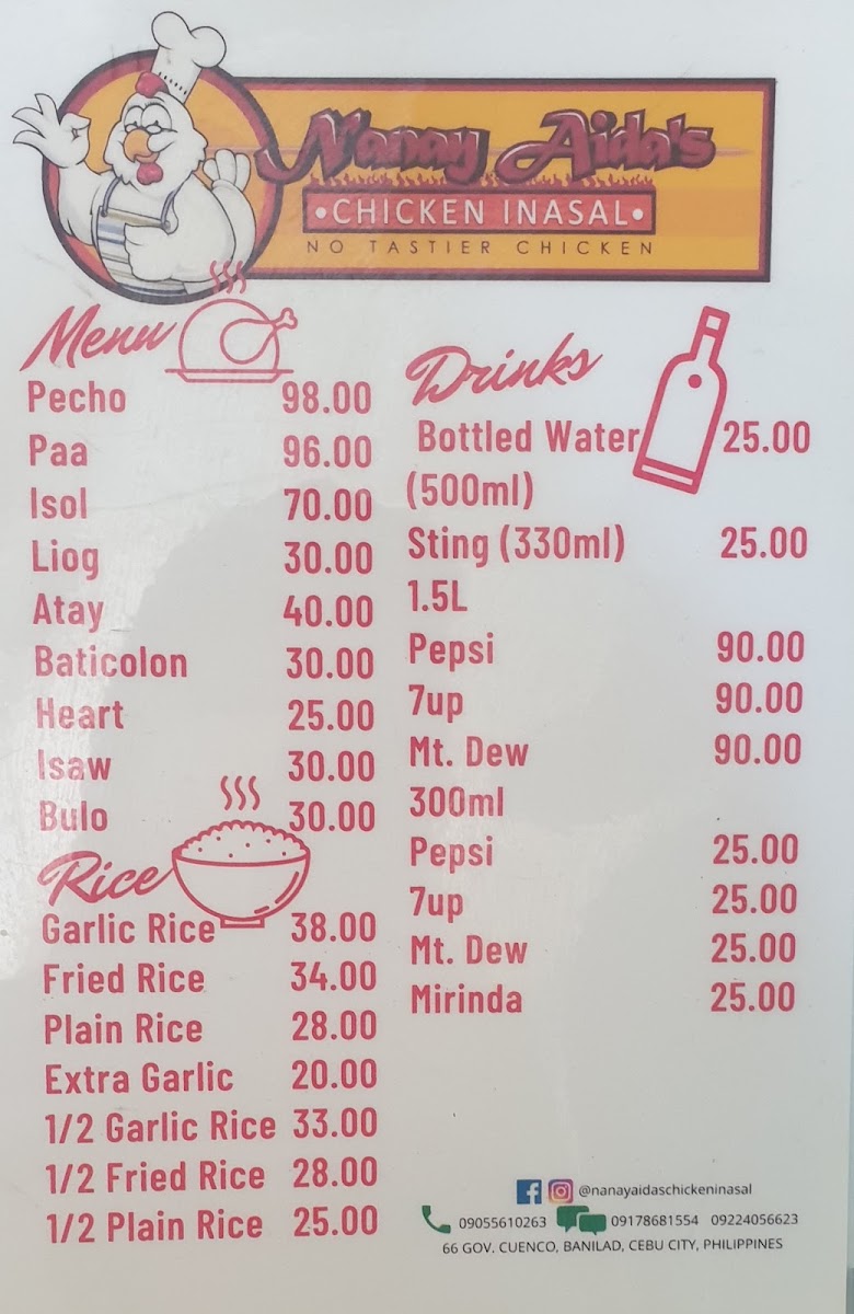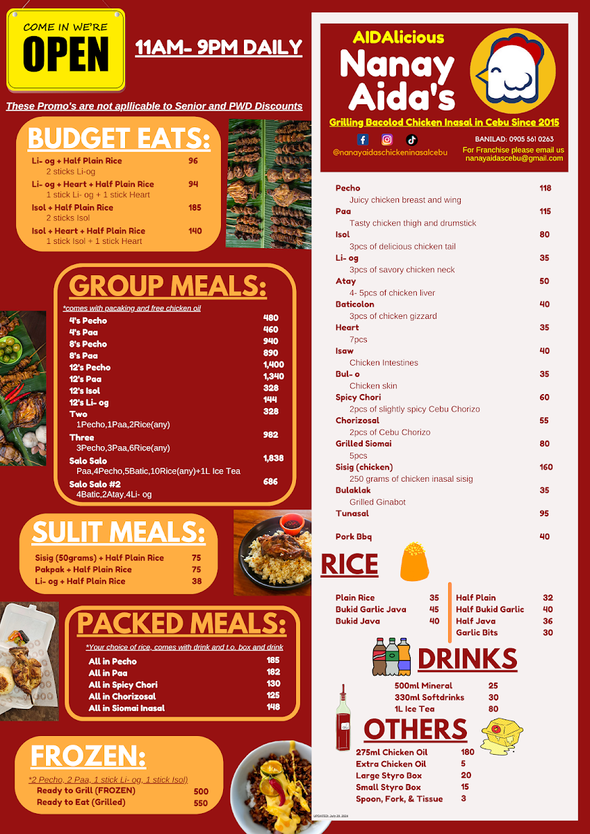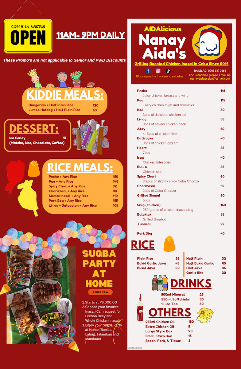 Introducing the menu at Nanay Aida's Chicken Inasal - Aidalicious, you’re immediately greeted by the irresistible aroma of marinated chicken, grilled to perfection. Nestled in Cebu City, this eatery brings the authentic taste of Bacolod-style chicken inasal right to your plate. Customers rave about the exceptional juiciness of the chicken, which packs an unforgettable flavor that sets it apart from other barbecue spots.